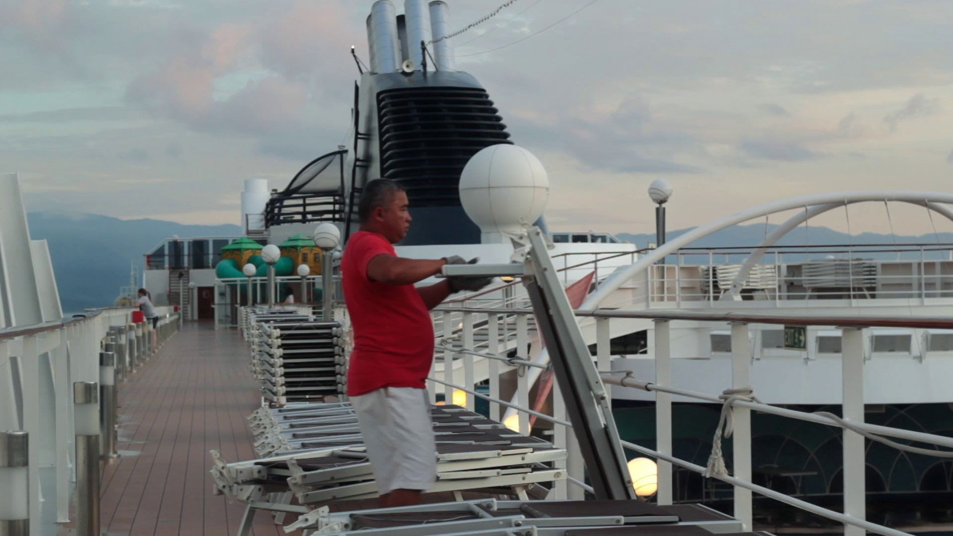 La noche pasa mientras los trabajadores del crucero empiezan su jornada: ponen la mesa, limpian las ventanas, desempolvan los sillones. Alguien prueba la música y otro enciende la cocina. Por lo general, nadie habla. Del otro lado, los turistas duermen mientras el barco avanza hacia la mañana.
